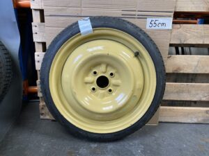 Note:Space saver wheels are additional tyres that are stored in the vehicle, which are smaller and thinner than your vehicle’s regular tyres. The smaller space saver wheels can be used on cars as temporary spare wheels in the event of a flat tyre. Space saver wheels do not necessarily have to have the same diameter as the alloy wheels fitted to the car. It’s partly to do with weight (less weight means less CO2 emissions), partly limited boot space and partly cost. Car manufacturers only make a small number of sizes to cater for all alloy wheel sizes fitted to different spec cars. The wheel offset may also be different from your alloy wheel offset, this is usually due to the narrow nature of the space saver and its ability to clear brake callipers. The spare tyre itself will carry sticker with information about maximum speed (50mp/h-80mp/h)– which you must stick to for safety reasons. This means unlike a standard spare, that skinny spares must be considered an emergency, get-you-home solution only. The original car tyre should be repaired/replaced as soon as possible.